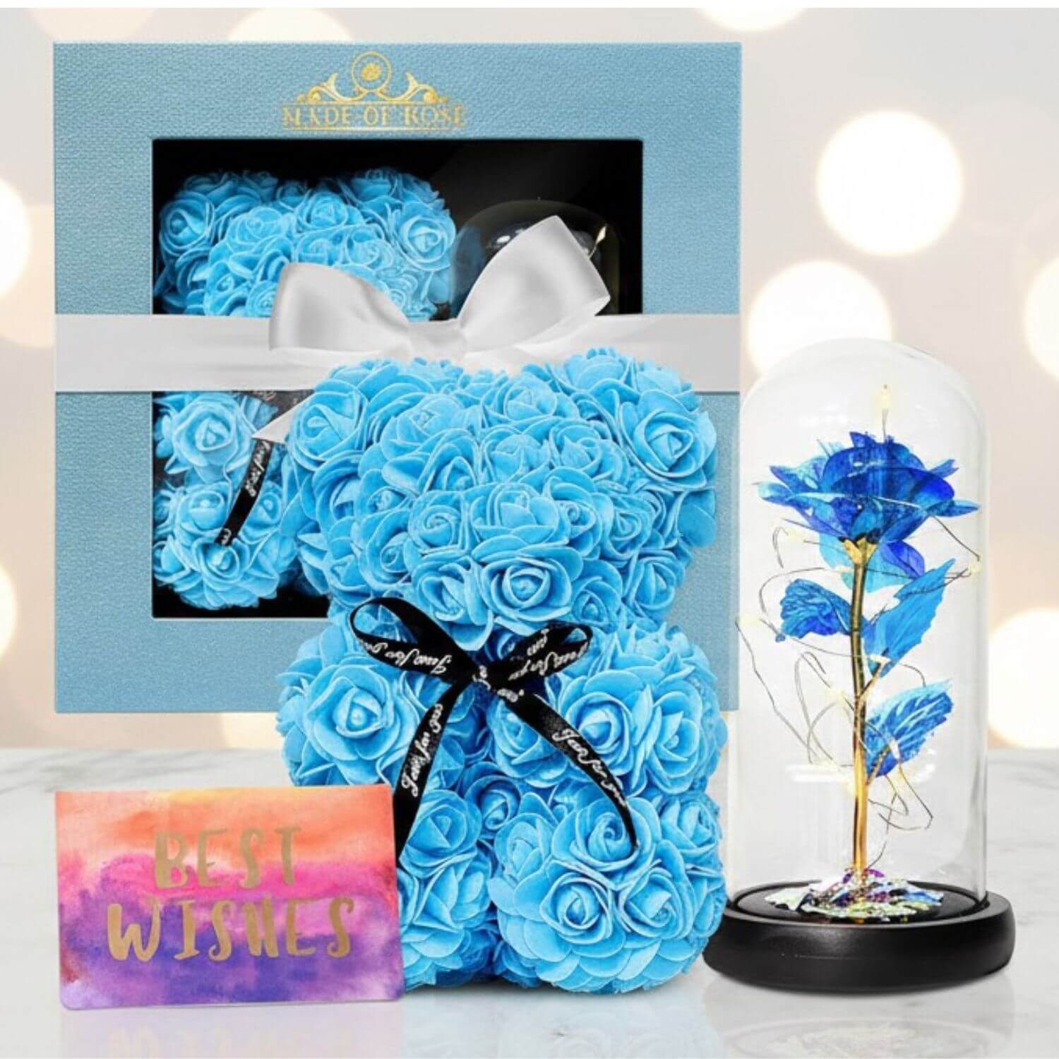 La Rose Galaxie se distingue par son fini iridescent spectaculaire qui reflète la lumière, symbolisant un amour aussi rare et infini que l'univers. Protégée pour durer éternellement, elle est accompagnée d'un Ours en Roses Bleues fait main, représentant la confiance, la loyauté et un lien émotionnel profond.